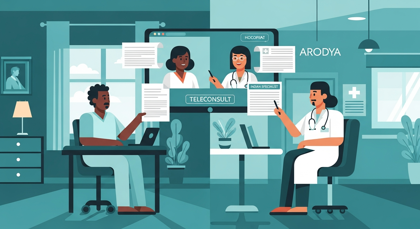Through Arodya, you submit your records and tell us which specialty you need. We match you with the appropriate specialist at an accredited Indian hospital and schedule a convenient time across time zones.